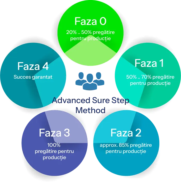 Punem bazele cu un sistem complet funcțional. Configurăm și integrăm sistemul, încărcăm date actualizate, simulăm procese și creăm un plan comun. Aceasta reduce riscurile și consolidează sprijinul stakeholderilor.